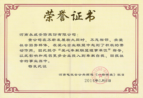 愛心奉獻(xiàn)聯(lián)盟理事單位-證書