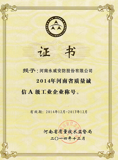 質(zhì)量誠信A級工業(yè)企業(yè)-證書